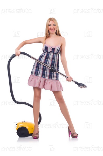 Молодая женщина с пылесосом на белом фоне