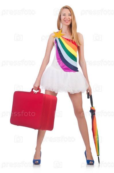 Женщина с чемоданами, изолированная на белом