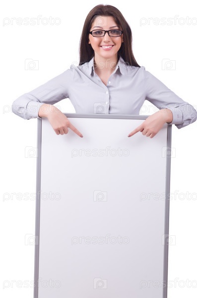 Молодая женщина с чистой доской на белом фоне