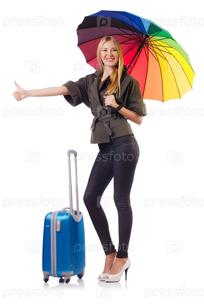 Женщина с чемоданом на белом фоне