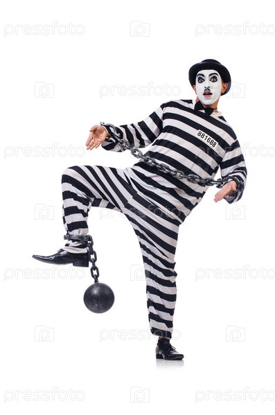 Забавный человек в гриме и с кандалами на белом фоне