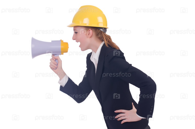 Деловая женщина в каске на белом фоне