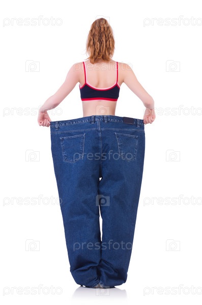 Женщина с большими джинсами в концепции диеты