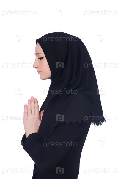 Молодая мусульманка молится, изолированная на белом