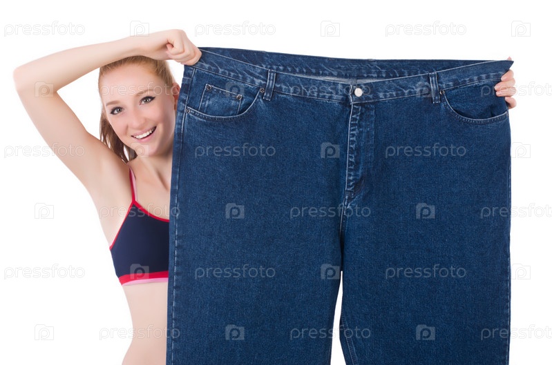 Женщина с большими джинсами в концепции диеты