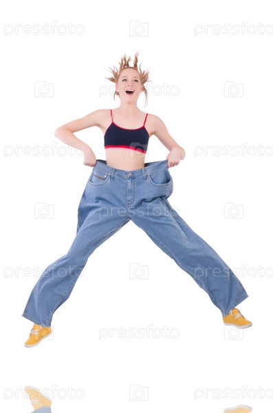 Женщина с большими джинсами в концепции диеты