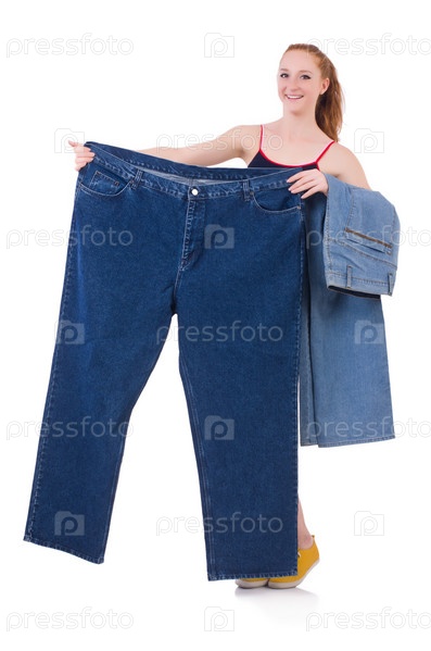 Женщина с большими джинсами в концепции диеты
