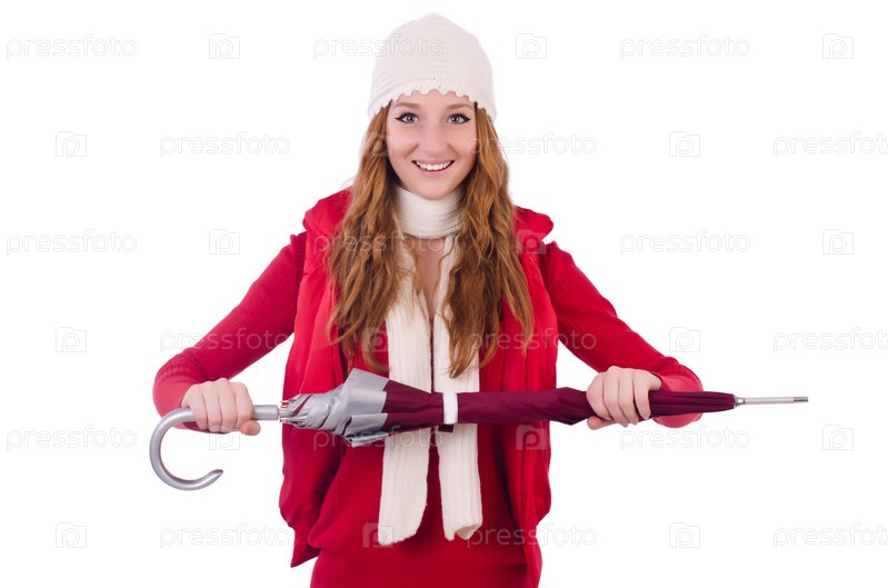Молодая женщина с зонтом на белом фоне