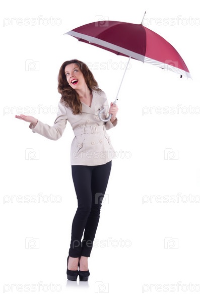 Женщина с зонтом, изолированная на белом