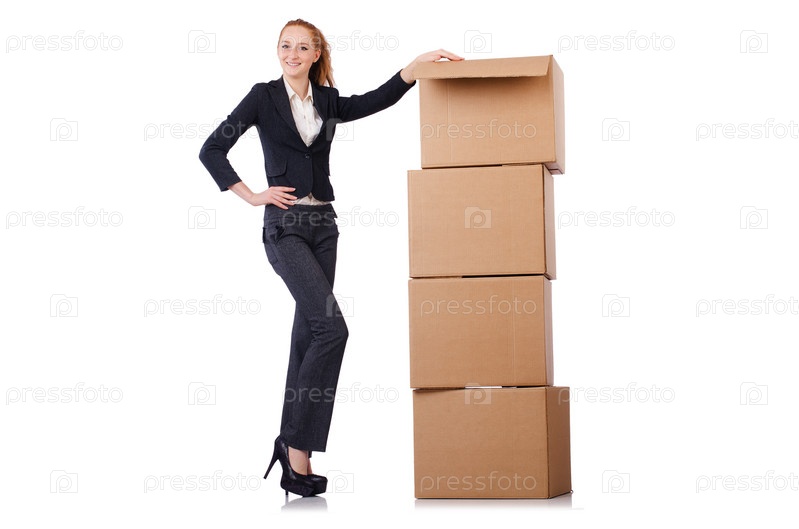 Деловая женщина с коробками на белом фоне