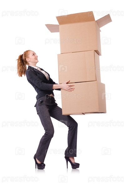 Деловая женщина с коробками на белом фоне