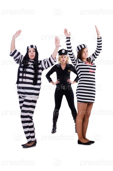 Заключенные и полицейский, изолированные на белом