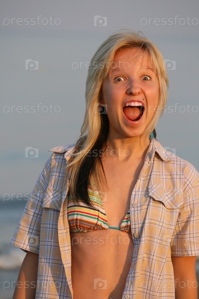 Молодая девушка в купальнике и рубашке кричит