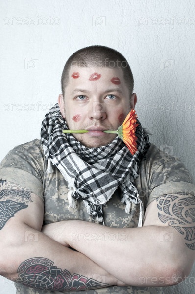 Мужчина со следами от поцелуев на лице держит герберу в зубах