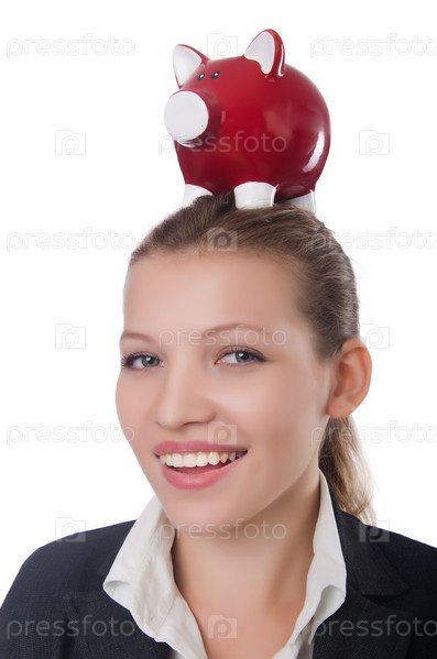 Бизнес-леди с копилкой на белом фоне
