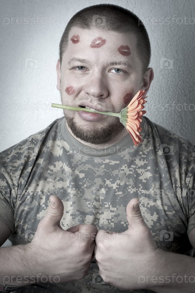 Брутальный мужчина со следами от поцелуев на лице держит герберу в зубах