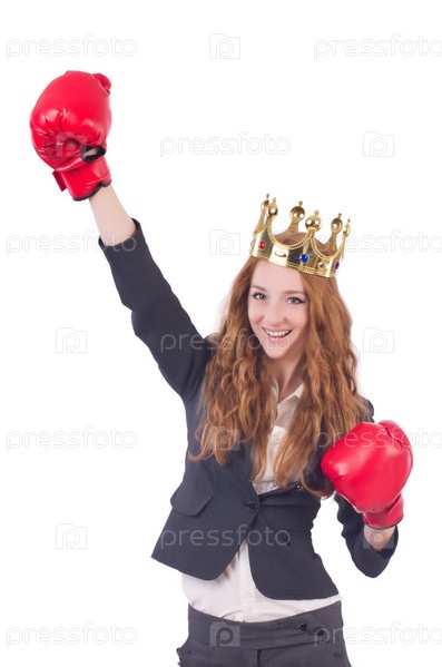 Бизнес-леди с боксерскими перчатками на белом фоне