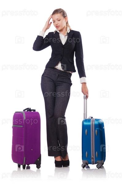 Женщина с чемоданами, изолированная на белом
