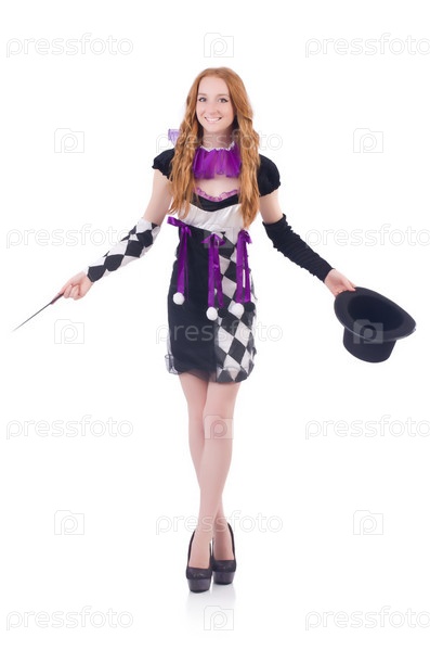 Фокусница с палочкой на белом фоне