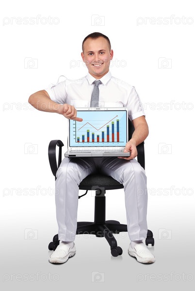 Мужчина и ноутбук с диаграммой