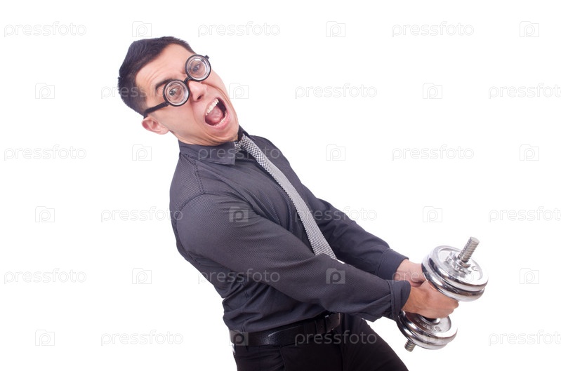 Смешной бизнесмен с гантелями, изолированный на белом фоне