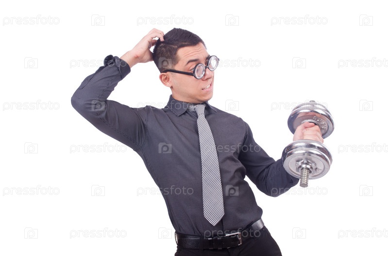 Смешной бизнесмен с гантелями, изолированный на белом фоне