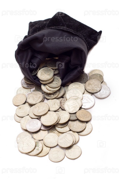Монеты на белом фоне высыпались из мешка