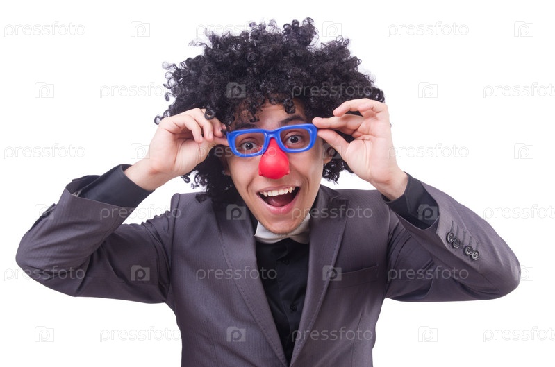 Бизнесмен в клоунском парике, изолированный на белом