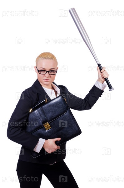 Деловая женщина с бейсбольной битой на белом фоне