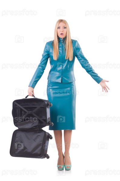 Женщина с чемоданами, изолированная на белом
