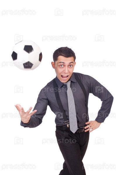 Забавный мужчина с футбольным мячом, изолированный на белом