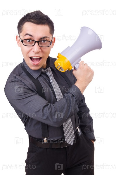 Бизнесмен с мегафоном, изолированный на белом