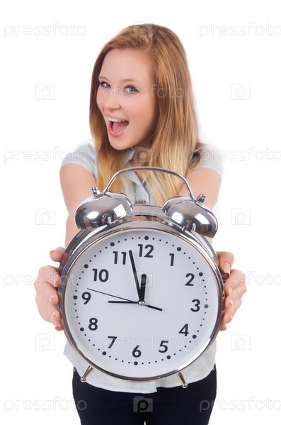 Молодая женщина с часами на белом фоне