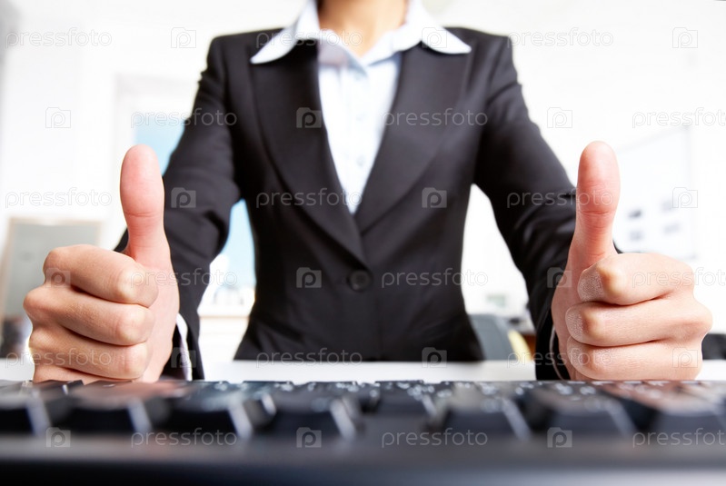 Женские руки, с поднятыми вверх большими пальцами, возле компьютерной клавиатуры