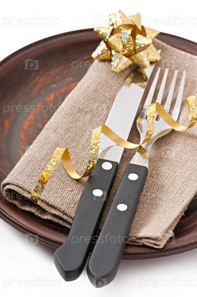 Нож и вилка на керамической тарелке с салфеткой на белом фоне