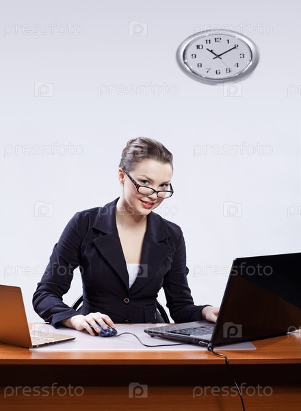 Молодая бизнес-леди в очках работает с двумя ноутбуками
