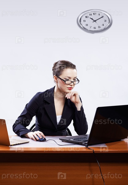 Молодая бизнес-леди в очках работает с двумя ноутбуками