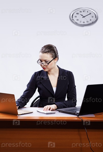 Молодая бизнес-леди в очках работает с двумя ноутбуками