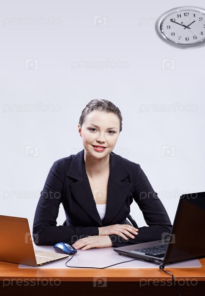 Молодая бизнес-леди сидит за столом с двумя ноутбуками