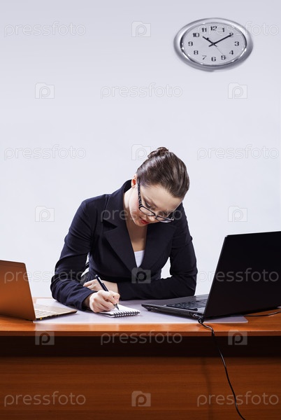 Молодая бизнес-леди делает пометки в блокноте, сидя за столом с двумя ноутбуками