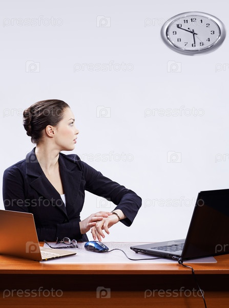 Молодая бизнес-леди сверяет время на часах, сидя за столом с двумя ноутбуками