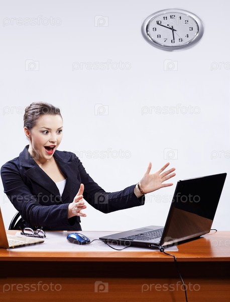 Радостная деловая леди смотрит на экран ноутбука