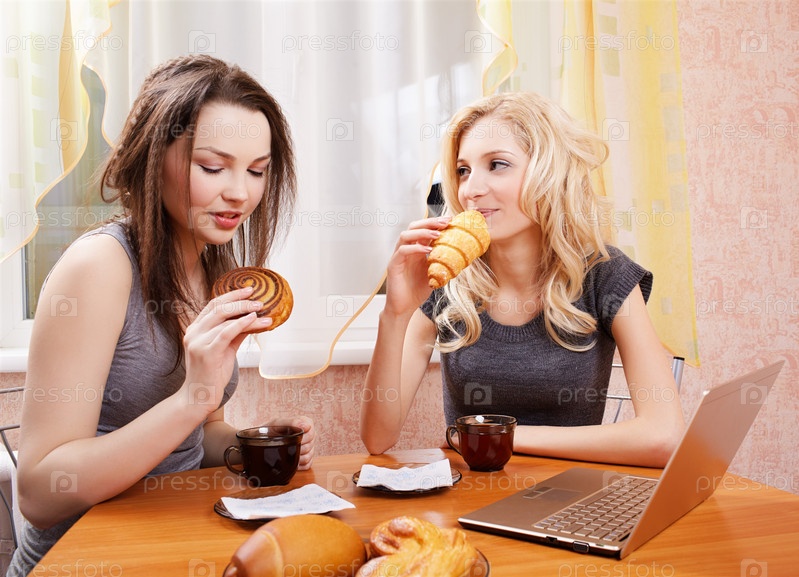 Две девушки с ноутбуком пьют чай с булочками