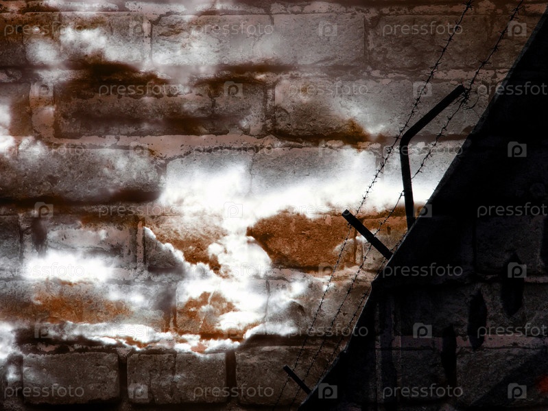 Колючая проволока на фоне кирпичной стены и неба