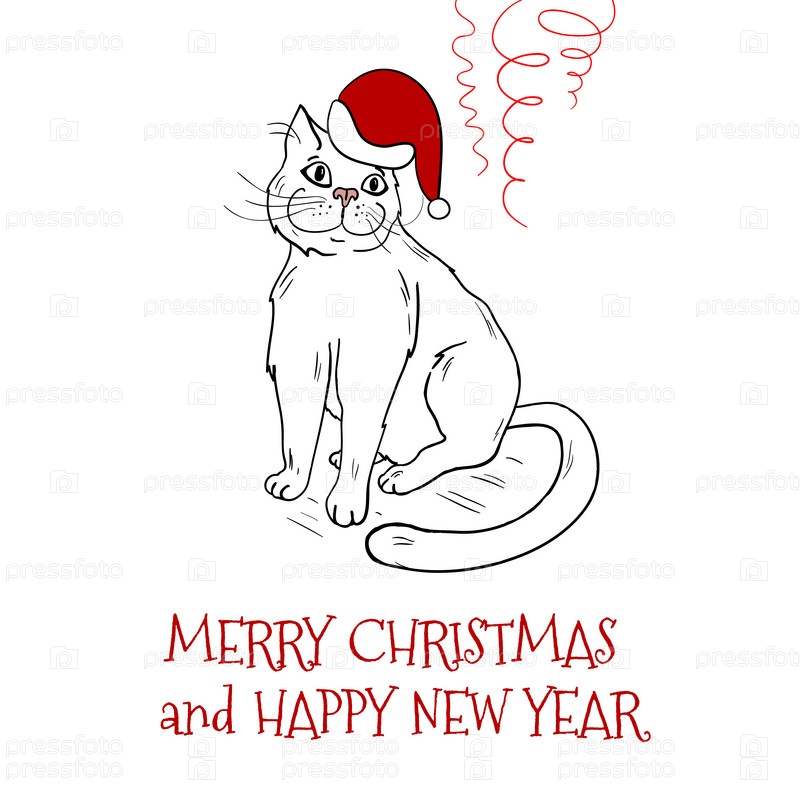 Новый год и Рождество. Открытка с котом в колпаке Санта-Клауса