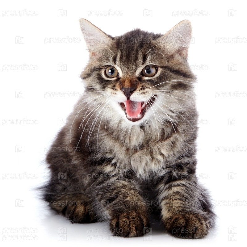 Полосатый пушистый котенок на белом фоне