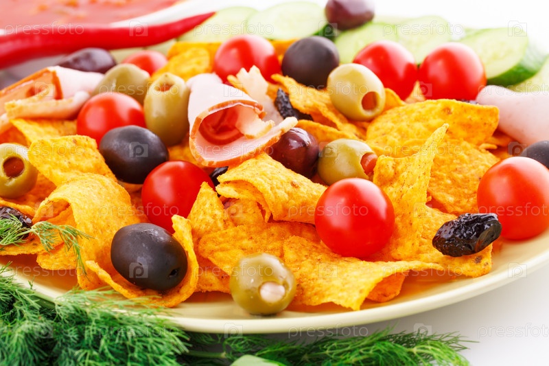 Начос, оливки, свинина и овощи