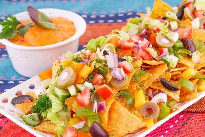 Начос, овощи и сырный соус