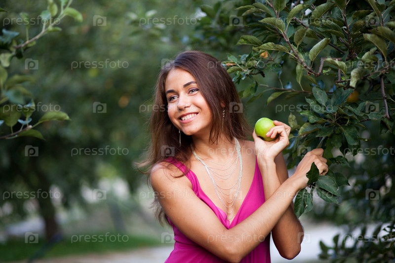 Молодая улыбающаяся брюнетка в платье с яблоком