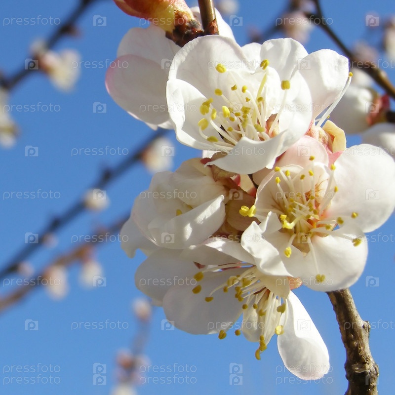 Цветущее абрикосовое дерево на фоне голубого неба